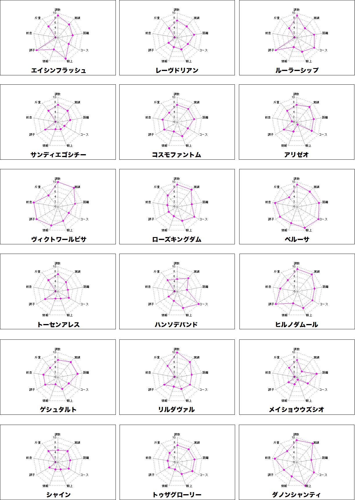 | ◆東京11R 安田記念(G1) ◎リーチザクラウン 内枠なのでうまいこと前に壁を作れれば勝つ可能性は高いが ハナを切るようだと厳しいと思われる。 展開次第だが、ほかにこれといった馬がいない。 レーダーチャートでも1頭だけ抜けているし 潜在能力は圧倒的に上なので その能力を引き出せる鞍上なら大丈夫でしょう。 ※全馬のレーダーチャートはこちら 人気が割れているので広めに。 |