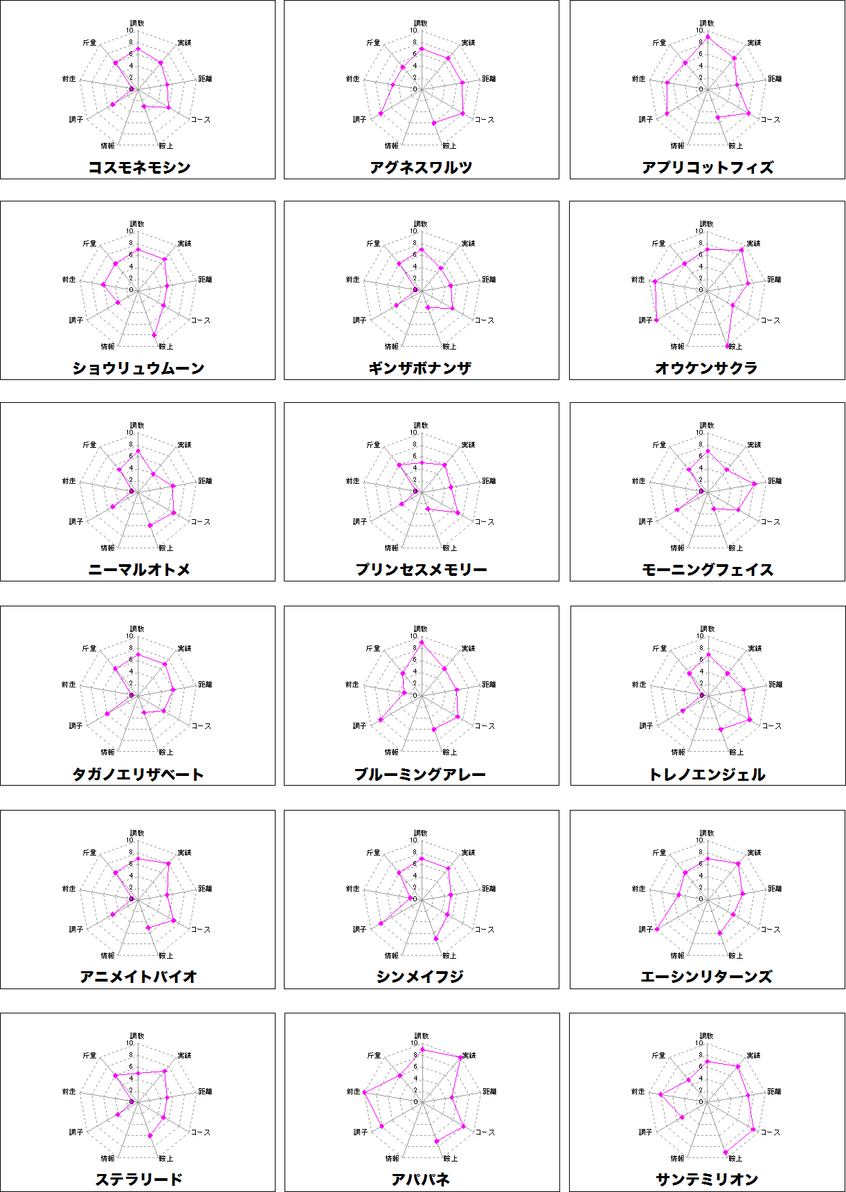 | ■オークス(G1) 全馬レーダーチャート! 全馬のレーダーチャートを作ったのですが アパパネのレーダーチャートが一番大きくなっています。 レーダーチャートの見方としては、 右側が馬の能力をあらわしており 左側が馬の上昇度をあらわしています。 つまり、右側が大きいほうが馬券に絡む確率が高くなり、 左側が大きいと一発あるかもということになります。 そうやって見ると、アパパネは馬の能力、上昇度ともに ずば抜けていることがわかります。 ただ、ひとつ欠点があるとしたら やはり距離でしょう。 距離さえクリアすれば圧勝できる能力値です。 ちなみに、全馬のチャートを見比べるとこんな感じです。 ⇒全馬レーダーチャート それでは最後に今週の確勝級の馬を。 ◆日曜 東京◎R 馬名はこちら⇒ 骨折休養明けになるが、調教は十分すぎるほど乗り込んでいる。 元々、デビューしたときから能力の高さは証明されており 骨折さえなければクラシックにも出れていた馬。 陣営は「秋の大きいところを狙う」と言っており、 メンバーを見ても明らかに能力上位のここでは負けられない。 ◆日曜 東京◎R 馬名はこちら⇒ ![]() 前走は勝った馬が強かった。 好位から力強く抜け出したレースが出来たことで これが今回の競馬につながるはず。 陣営も「オープンでも活躍できる馬」と豪語するように 今回は最低でも勝ち負けになる。 |